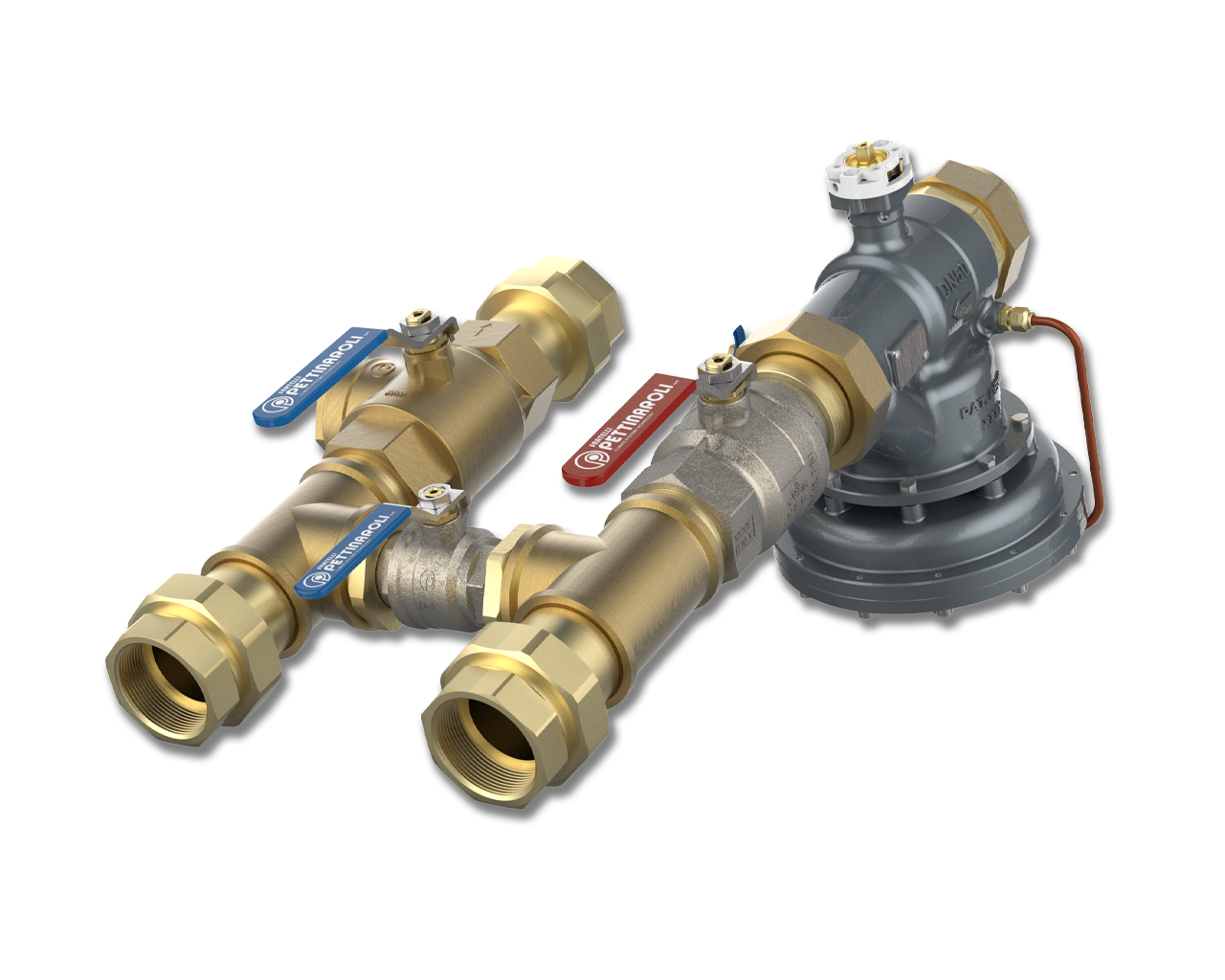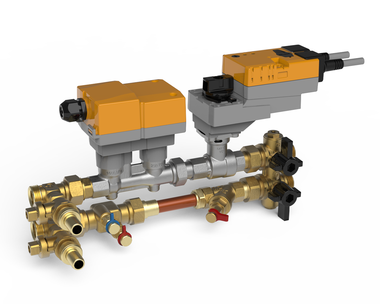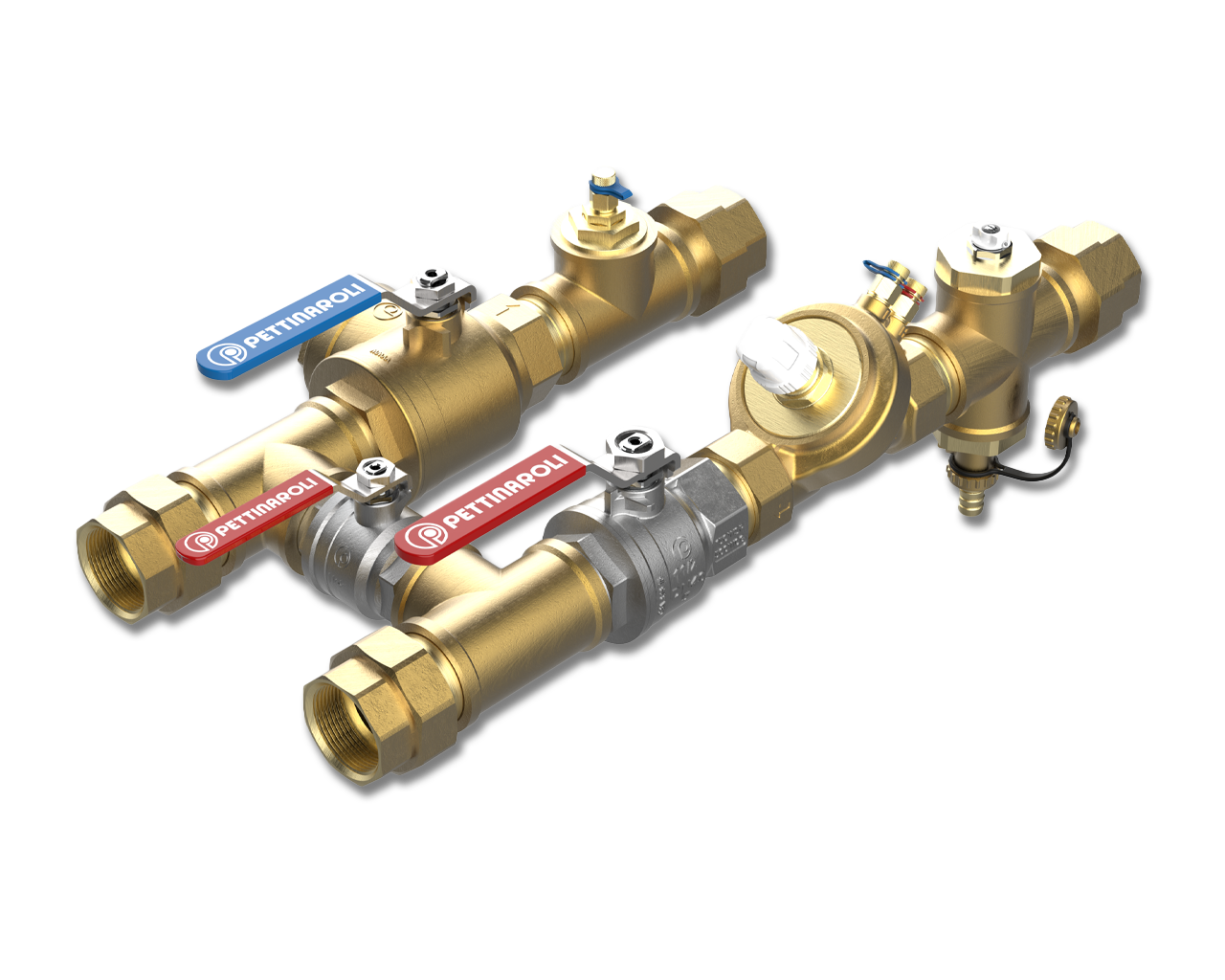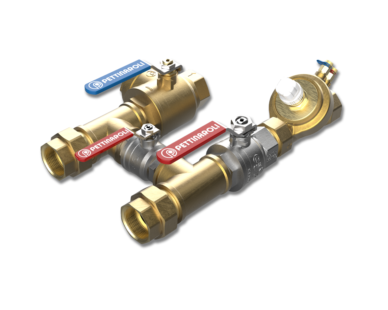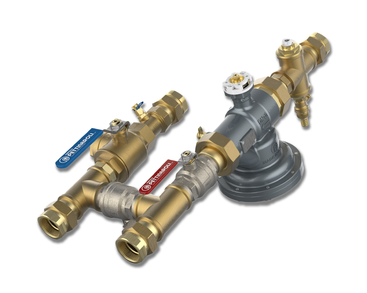 Pettinaroli VX 29 Series valve set including a Vortex 4 40mm flushing by-pass, Dynasty dirty water resistant PICV, venturi flow measurement device and a full bore 10mm flushing drain mounted in the return.