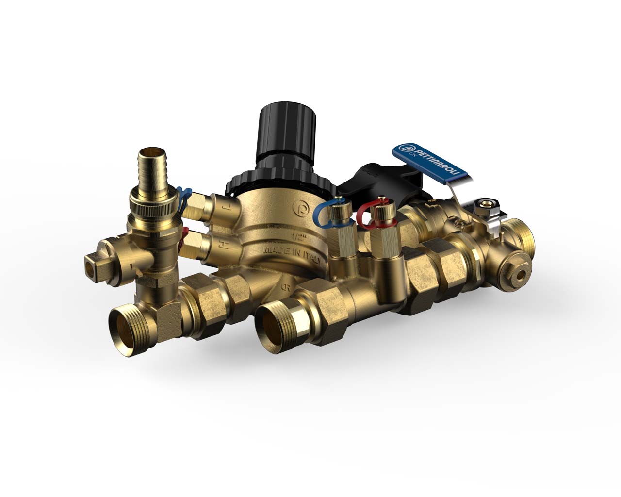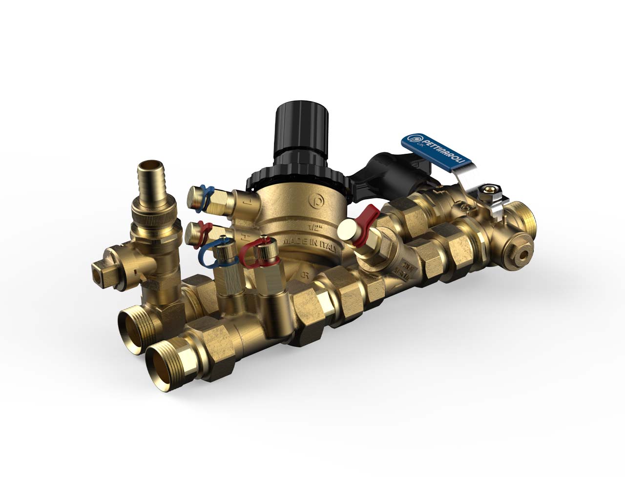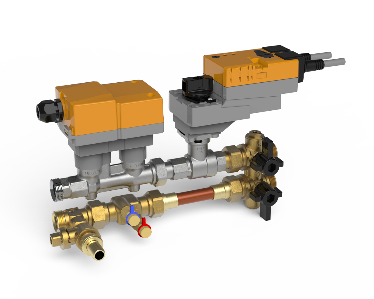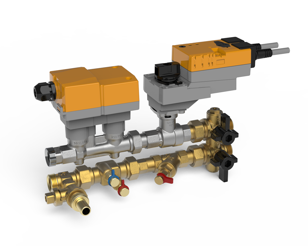 Pettinaroli VX 29 Series valve set including a Vortex 4 40mm flushing by-pass, Dynasty dirty water resistant PICV, venturi flow measurement device and a full bore 10mm flushing drain mounted in the return.