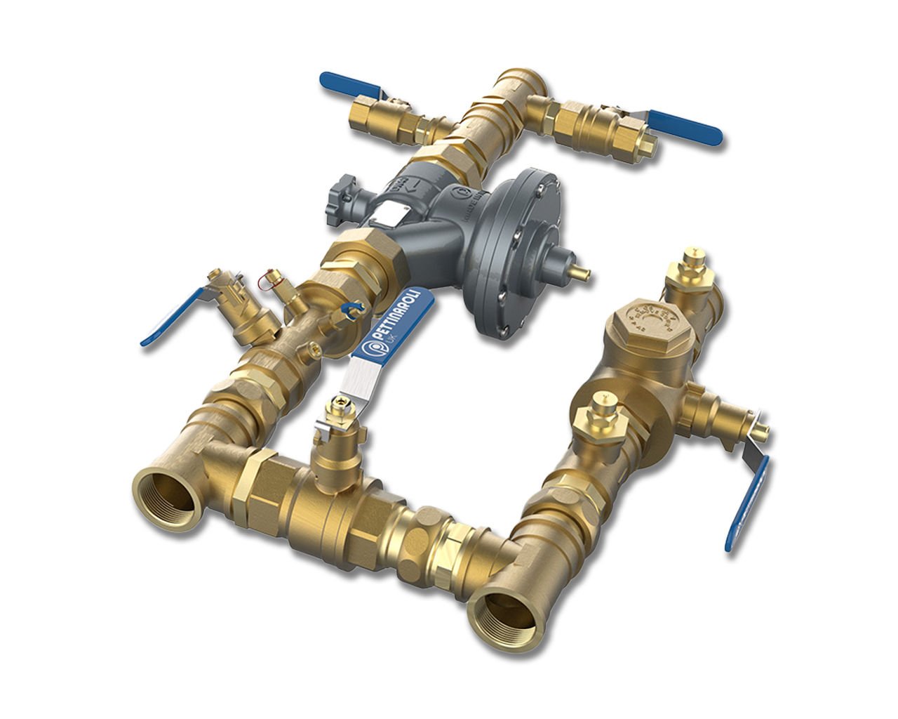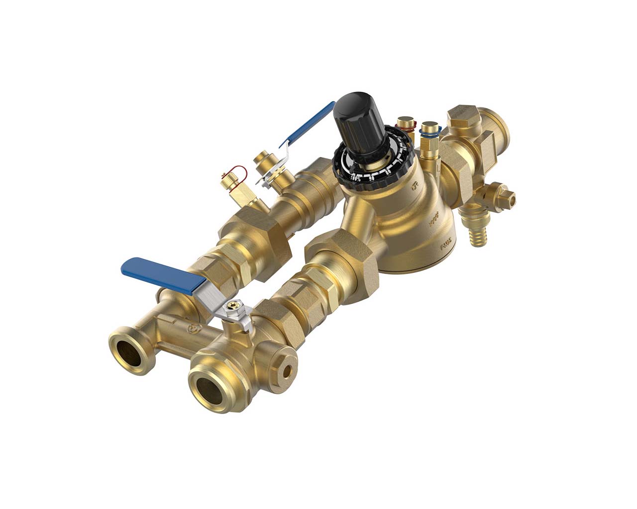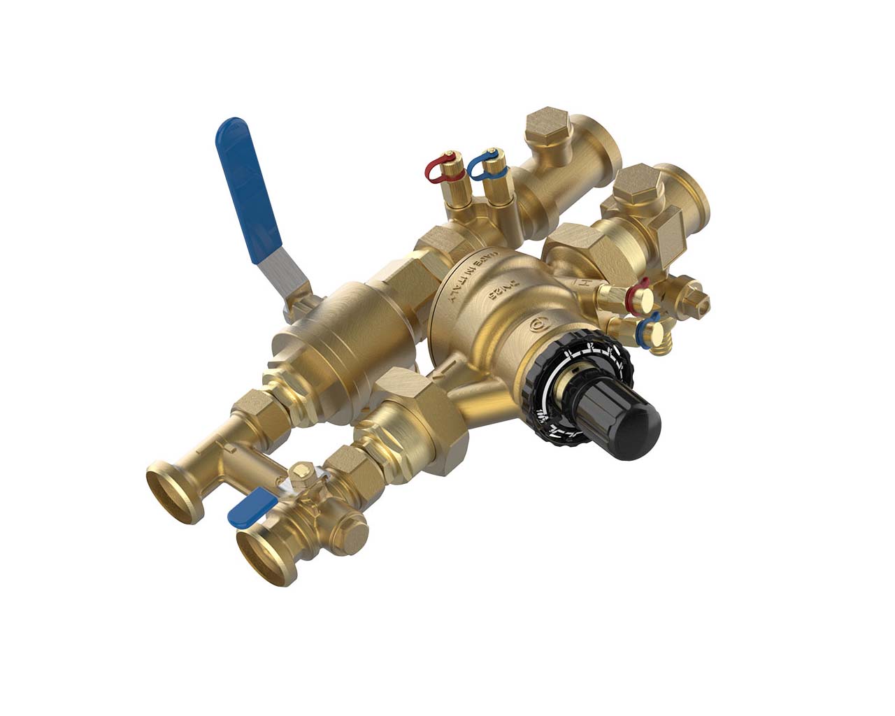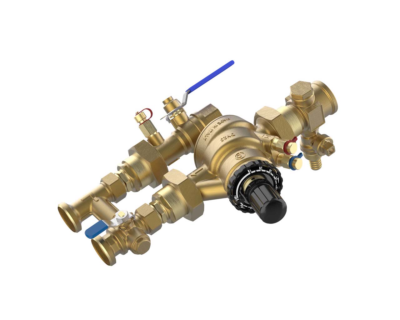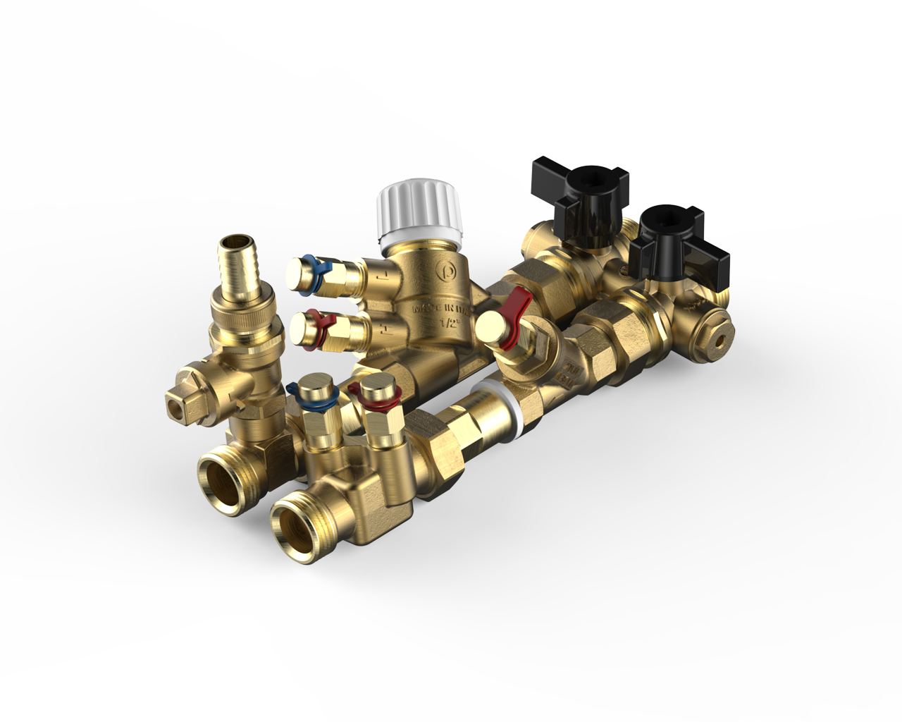 Pettinaroli VX 29 Series valve set including a Vortex 4 40mm flushing by-pass, Dynasty dirty water resistant PICV, venturi flow measurement device and a full bore 10mm flushing drain mounted in the return.